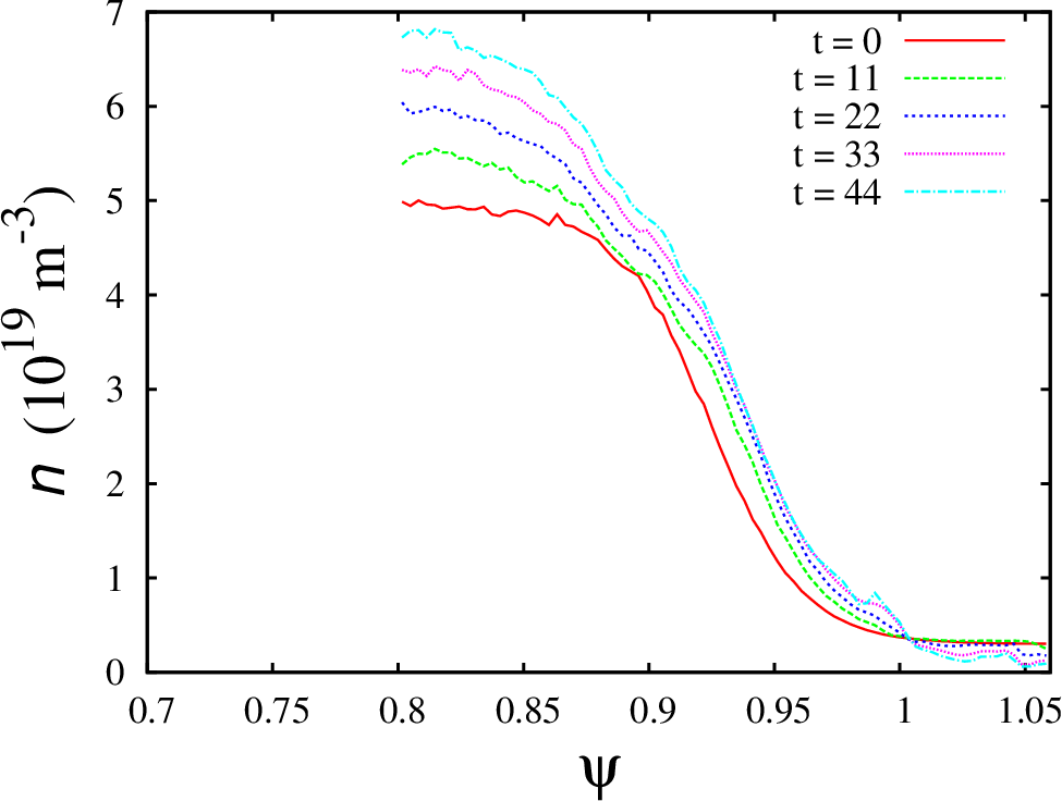 where is the plasma pressure in the original equilibrium files that is updated with the plasma pressure , $dp$ is the gap between the equilibrium pressure and the plasma pressure found by the XGC0 code at . This formula is applied for from 0 to 0.83. The characteristic width of the transition region is set to 0.2. The bootstrap current profile is updated in the same way.